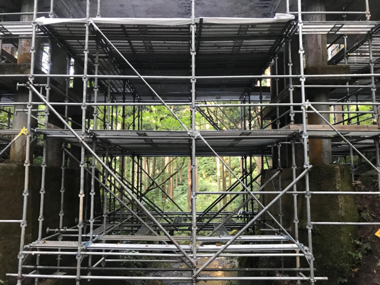 工事でした。橋梁と言えば吊足場を想像しますが、今回は地上からの棚足場仕様で施