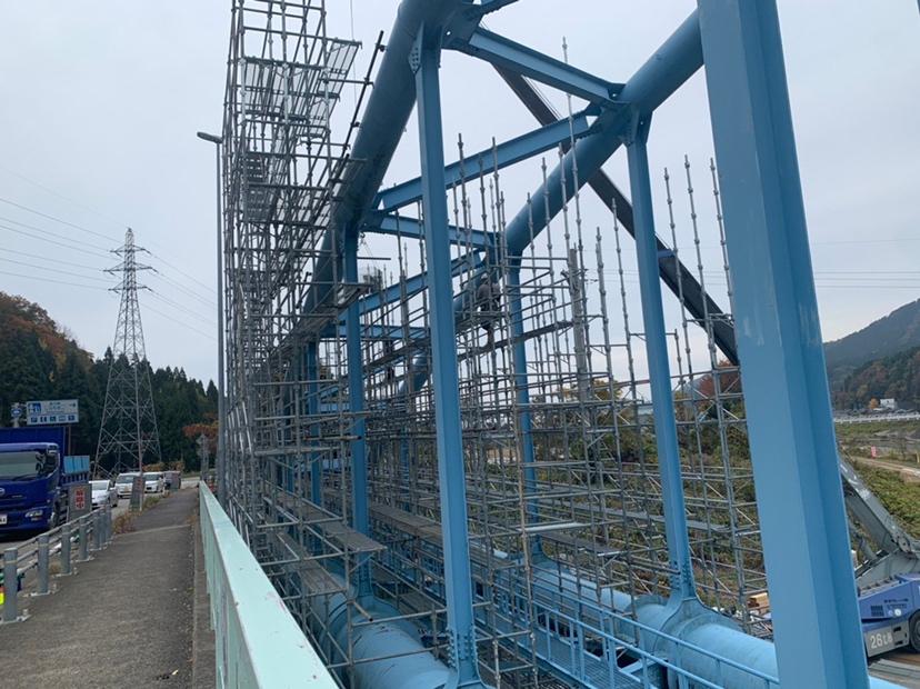 今回の現場は野々市市から白山市の道路にかかる水管橋の塗装工事に伴う足場施工を